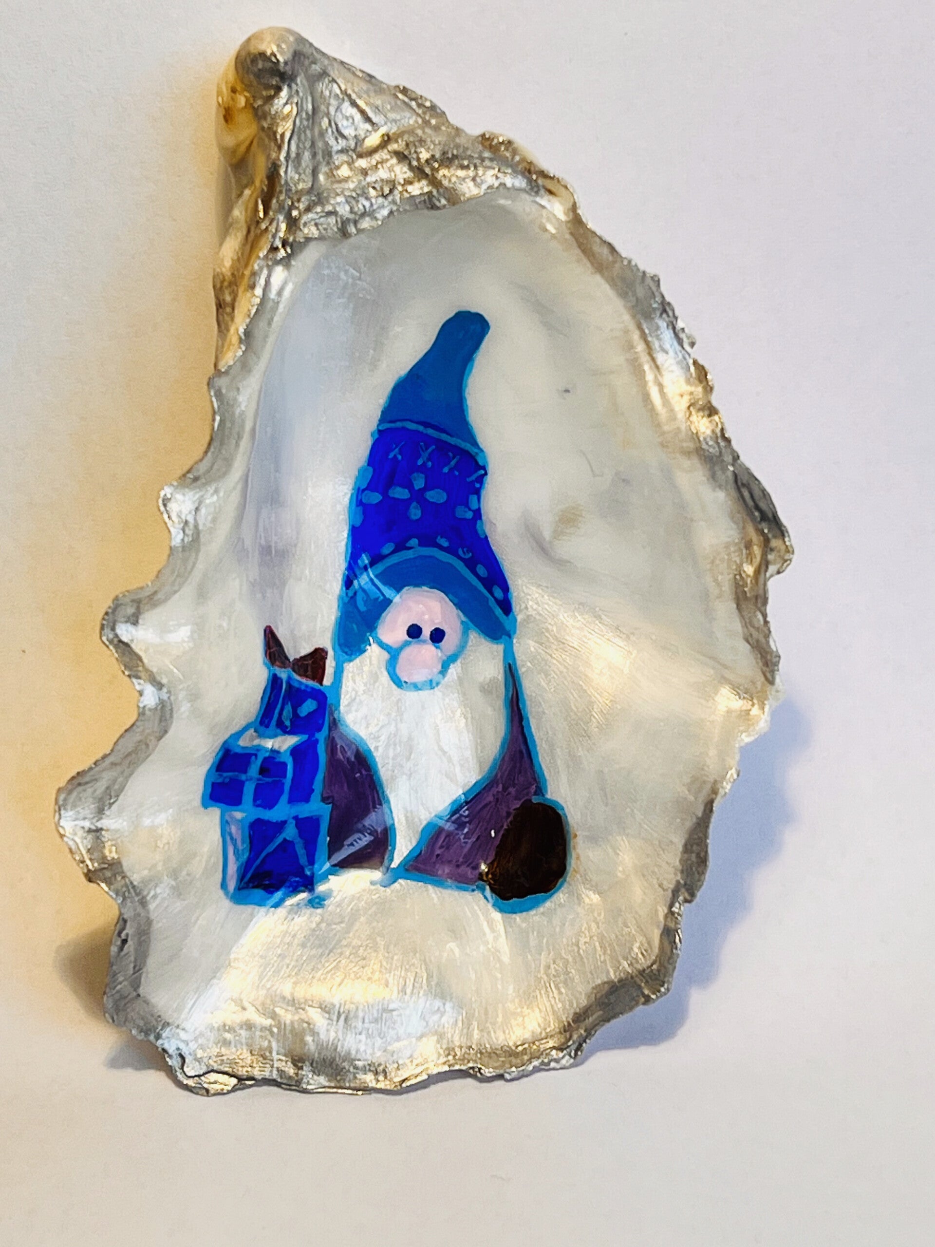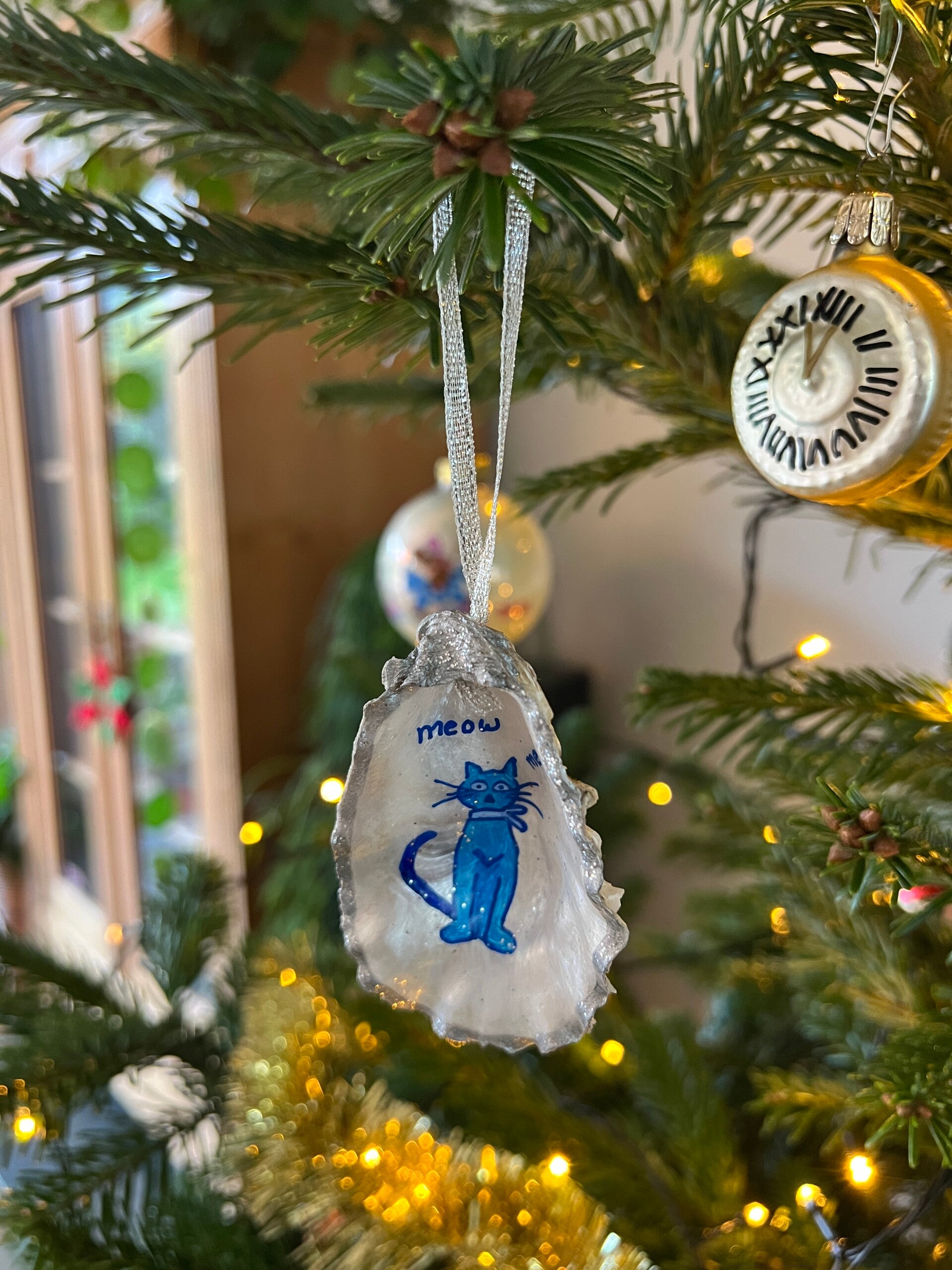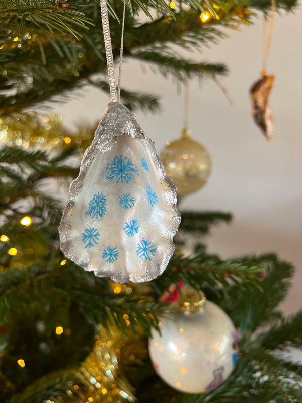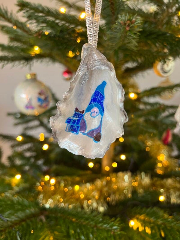 Handgeschilderde Oesterschelpen voor in de Kerstboom. Blauw-Zilver: kerstboompje, kabouter, sneeuwkristallen, poesje. 1 st €15,= | 2 st € 25,00 | 4 st € 50,00
